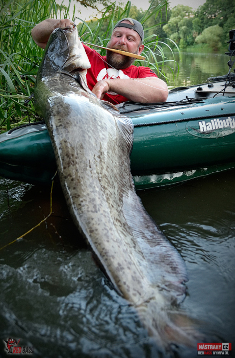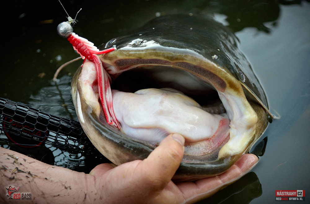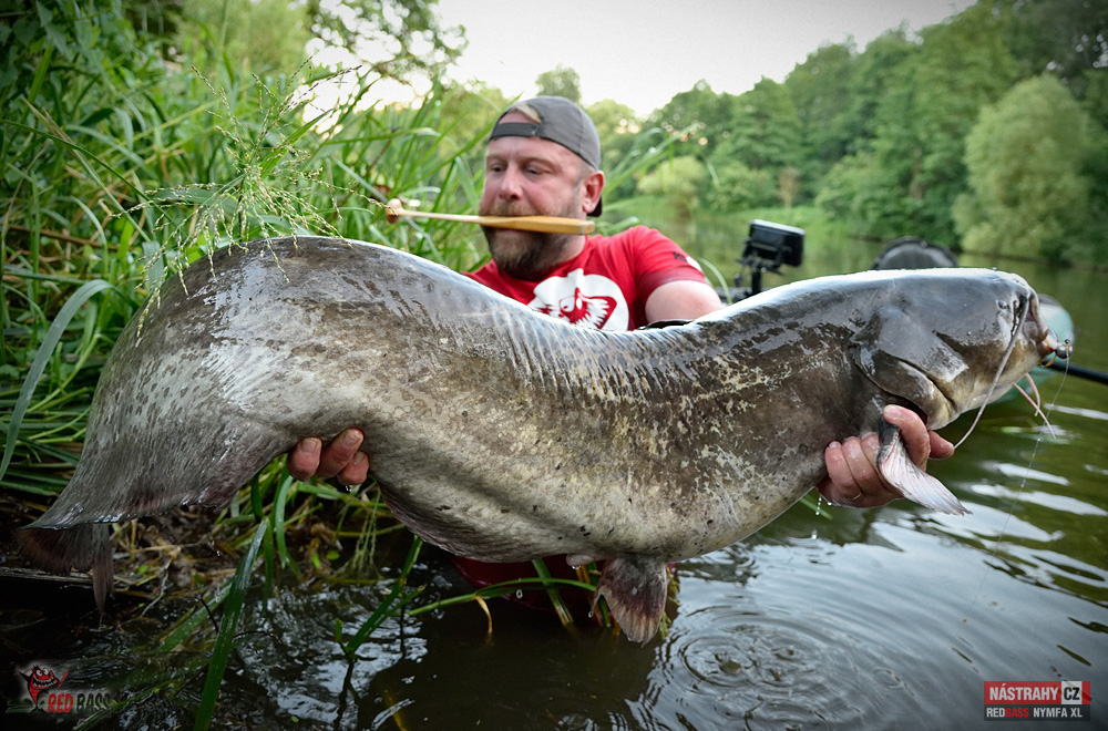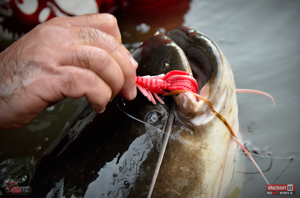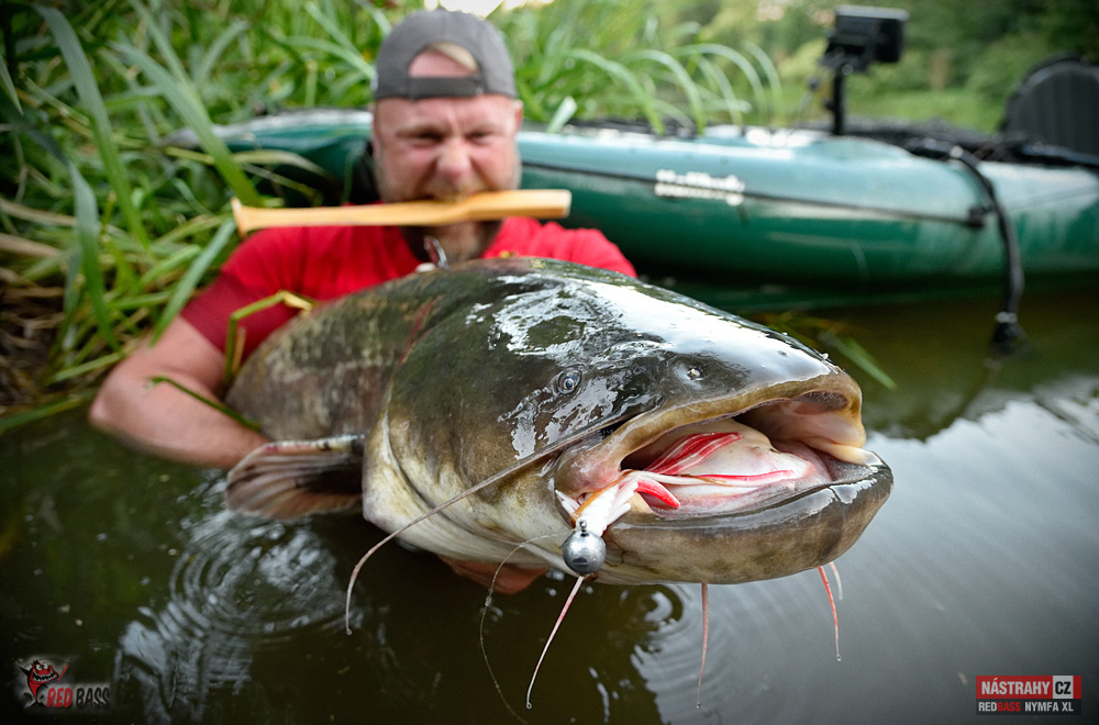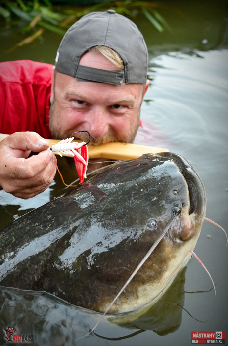 To se rýmuje! Lov sumců s vábničkou s použitím naší nymfy 13 cm jsem už ověřil před několika lety. Po dvouleté pauze jsem opět vyrazil. Na řeku s průměrnou hloubkou dva metry. Netrvalo to více než 20 minut a přišla na hloubce 2,3 m prda jak z děla a o zábavu bylo postaráno. Nymfu jsem měl cca 1,3 m hluboko. Následoval cca 15 minutový boj (z kajaku není žádoucí rybu moc rvát) a pak se ukázal krásný cca 150 cm dlouhý sumec okolo 25 kg. Nádherný zážitek to byl! Nymfu nastražuji na větší jigovku a dávám dvě za sebe, aby bylo více "třásní". Návazec jsem měl z fluorocarbonu 0,45 mm. Řeka téměř neproudí, tak v pohodě stačila jigovka 20 g (šlo by to i s 10-15 g). Doporučuji všem. Tento způsob sumcařiny bez nutnosti opatřování nástrah a držení jich při životě (rybky, rousnice apod.) je super. A jde vyrazit i na kratičký, např. hodinový lov.