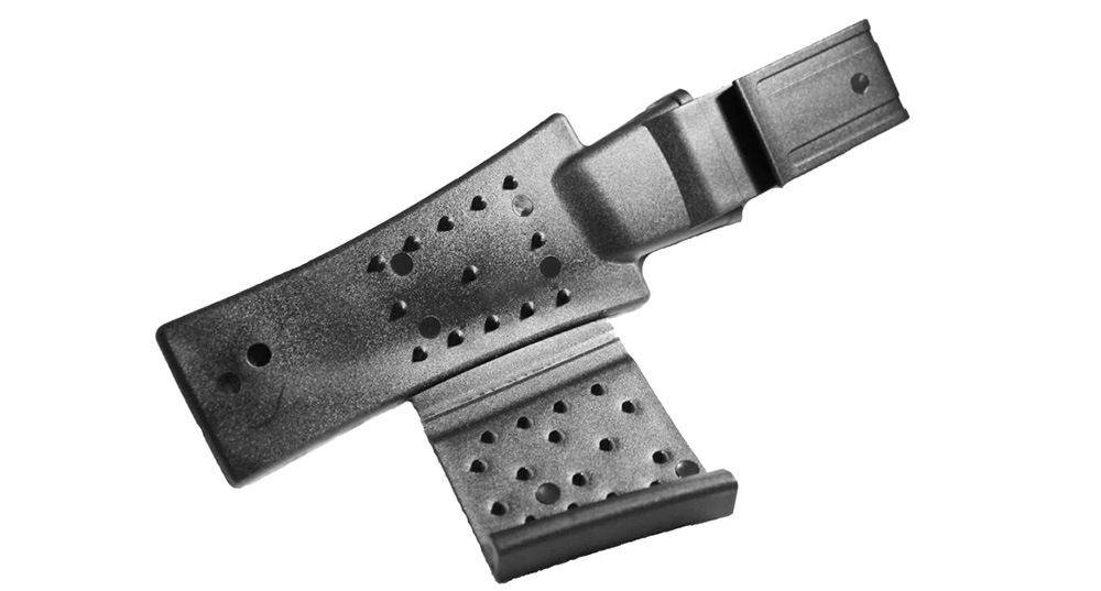 Bezpečný zaisťovací mechanizmus umožňuje nosiť nôž v puzdre aj obrátene (rukoväťou nadol) bez rizika vypadnutia.