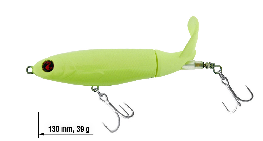 Môžete ho ťahať pomaly, rýchlo, pozastaviť, či rýchlejšie a nepravidelne popoťahovať. Najväčších úspechov a vyprovokovaných záberov sme však mali pri plynulom a pomalom priťahovaní. Priťahujte Whopper tak, aby sa lopatka točila a stále plávala konštantnou rýchlosťou. Všetky varianty Whopper Plopper sú už osadené kvalitnými X-Strong trojháčikmi.